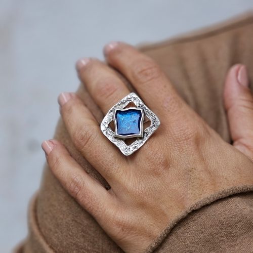 Inel din Zamac argintat cu dimensiune reglabila. Element lucrat cu rasina.