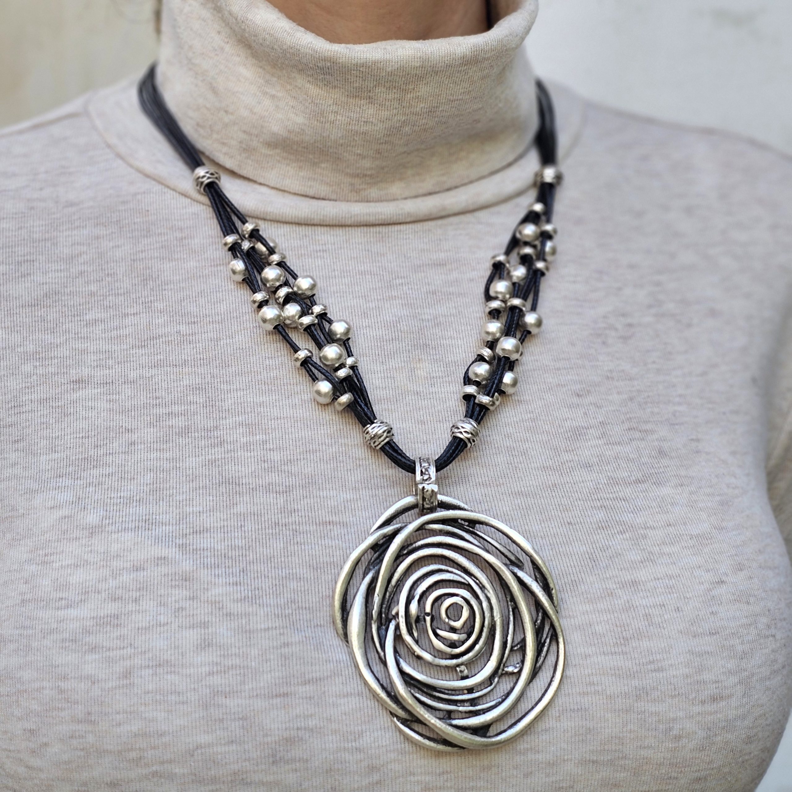 Pandantiv din Zamac placat cu argint pe snur textil.